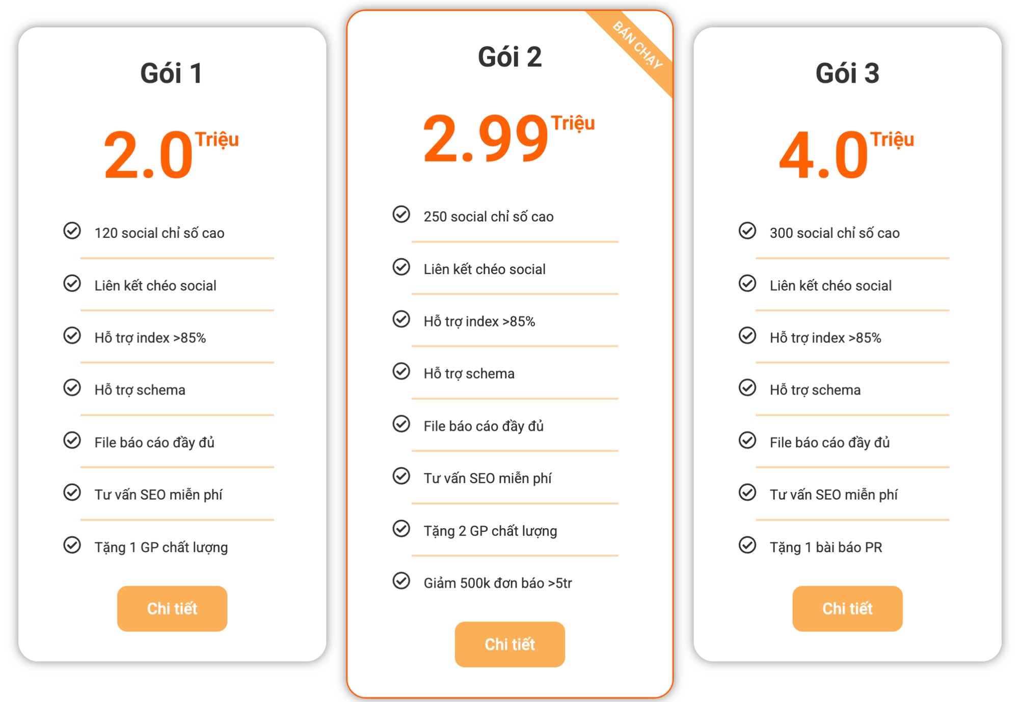 - Gói 2 triệu: 120 social chỉ số cao, liên kết chéo social, hỗ trợ index >85%, hỗ trợ schema. File báo cáo đầy đủ, tư vấn SEO miễn phí, tặng 1 GP chất lượng.