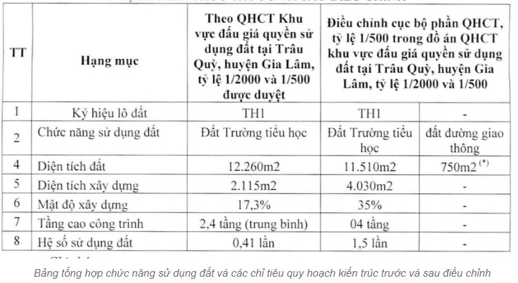 Nay, điều chỉnh tách 750m2 đất thành đường giao thông, phần đất còn lại để xây trường tiểu học là 11.510m2; mật độ xây dựng 35%; tầng cao công trình 4 tầng; hệ số sử dụng đất 1,5 lần.